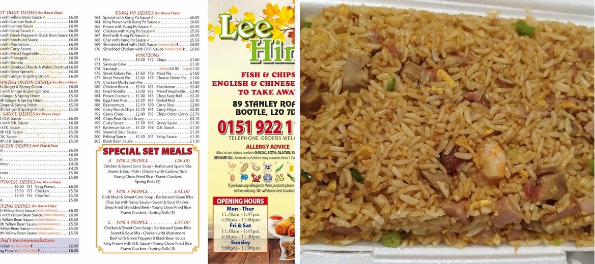 Savor delicious Chinese takeaway at Lee Hing, located at 89 Stanley Rd, Bootle. Enjoy generous portion sizes, mouthwatering salt and pepper dishes, and the best fish and chips in town. Join the queue for incredible flavors at affordable prices! Call +44 151 922 1154 for orders.